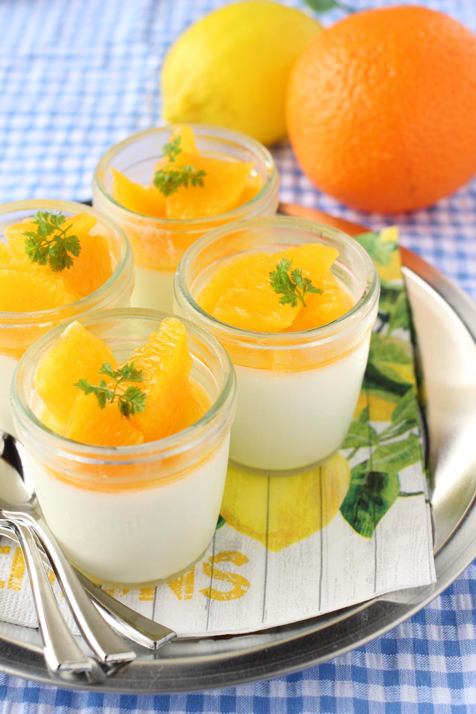ヨーグルトを使ったヘルシーデザート。ヨーグルトのコクがさっぱりとしながらも味に深みを加えます。はちみつレモンの爽やかなオレンジのマリネを添えて、見た目もとても爽やか!食後のデザートにピッタリです。小さめのカップ6個分作れます。