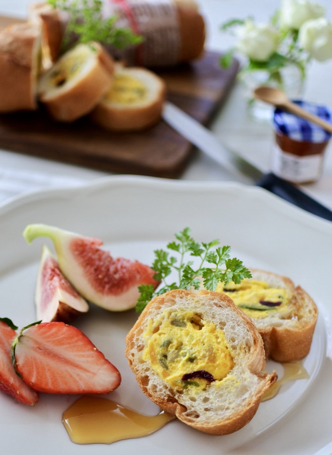 かぼちゃとクリームチーズのサラダを、くり抜いたバゲットに詰め込み、カットしていただきます。