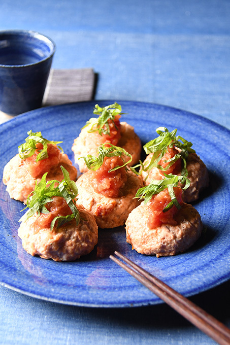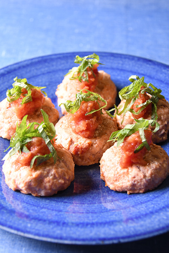 - ボウルに糀トマト(大さじ3)と鶏ひき肉、角切りの大根を入れ、粘りがでるまで練る。4等分に分けて丸型にする。