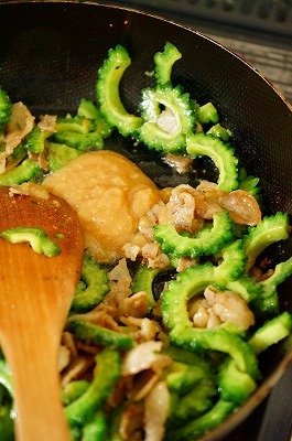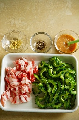 - フライパンにサラダ油とにんにくを入れ熱し、香りがしてきたら豚ばら肉を入れ塩・こしょうで下味し白っぽく色が変わるまで中火で炒めゴーヤを入れ炒める。
