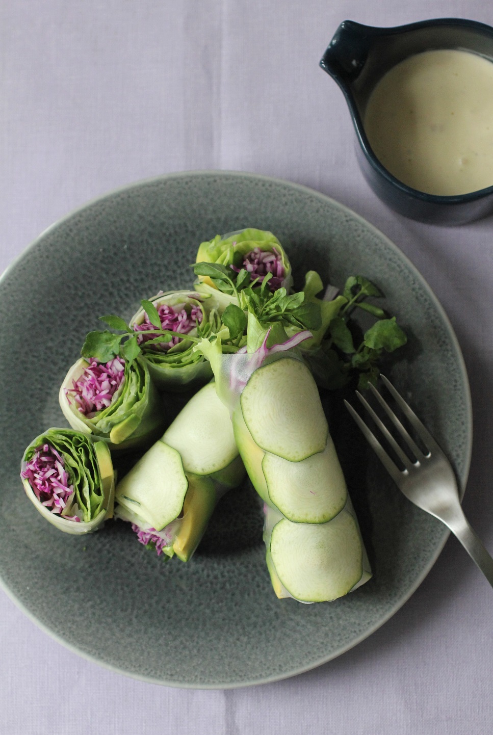 - 生春巻きの皮をぬるま湯につけてもどし、手前にレタス・紫キャベツ・クレソンを置き、奥にズッキーニ・アボカドを並べて手前からしっかりと巻く。食べやすい大きさに切り器に盛り、シーザーソースを添える。