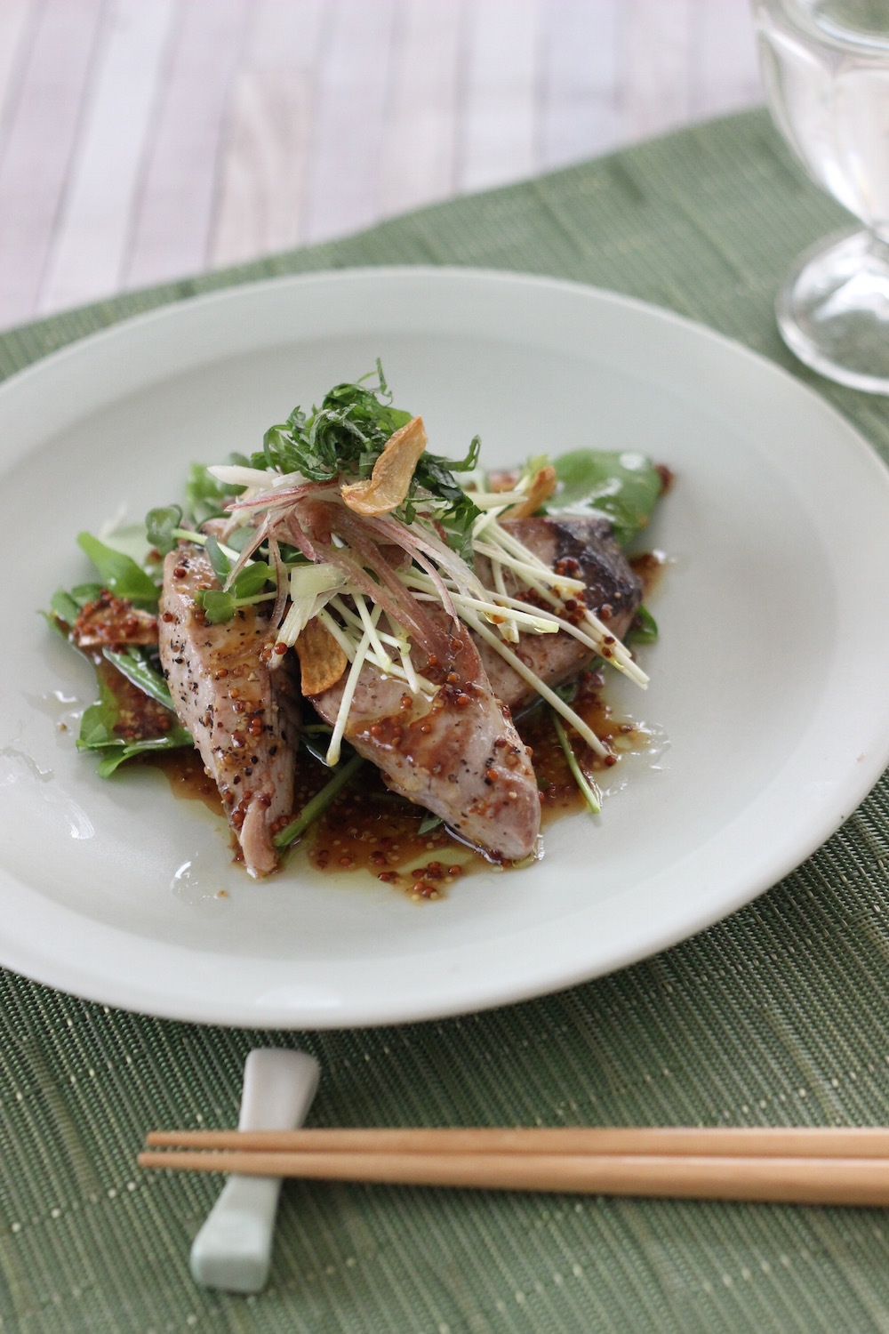 - 器にルッコラを広げて盛り、鰹、貝割れ大根、茗荷、大葉をのせ、取り出しておいたにんにくを散らし、3を回しかける。