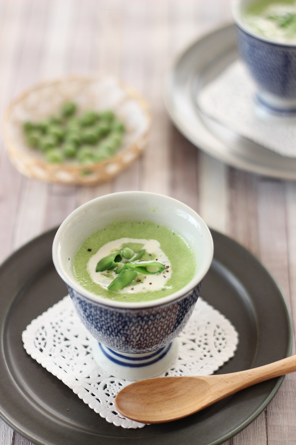 グリーンピースと豆乳を使った色合いがとても綺麗な優しい味の和風スープです。冷たくしても美味しいです。