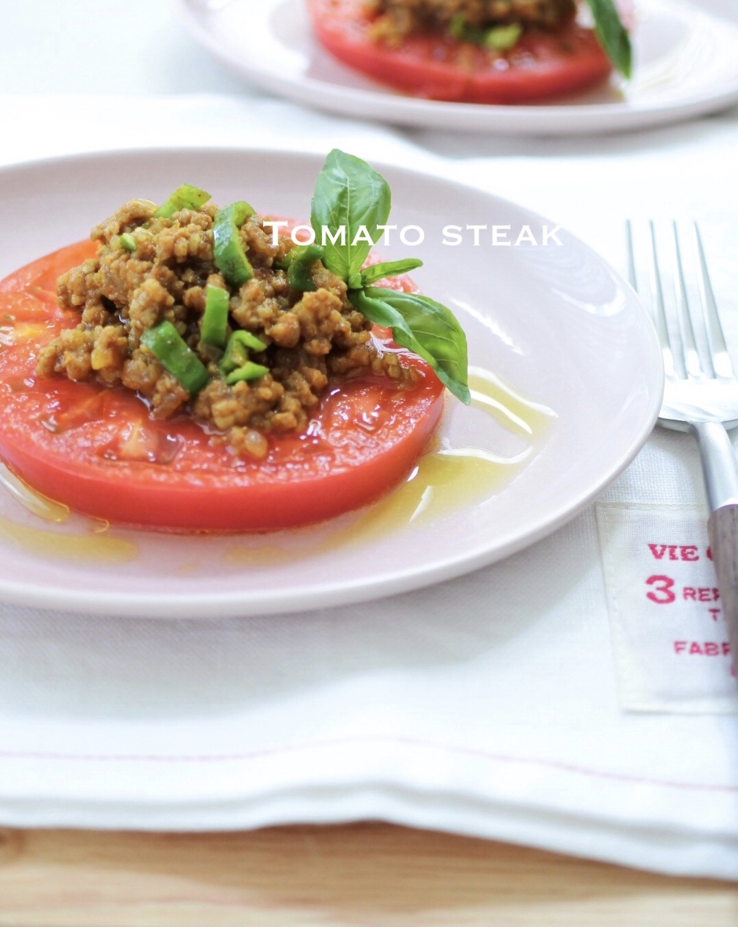 厚切りトマトにひき肉カレーを乗せた夏にぴったりのメニューです。