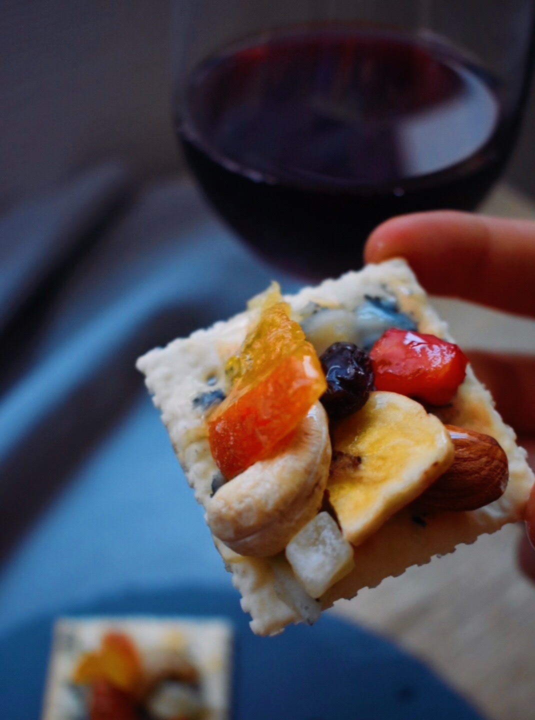 - クラッカーにゴルゴンゾーラチーズを塗り、ドライフルーツ、ナッツを乗せる。