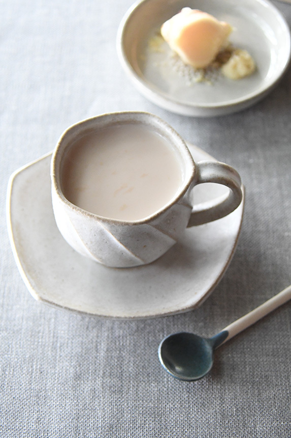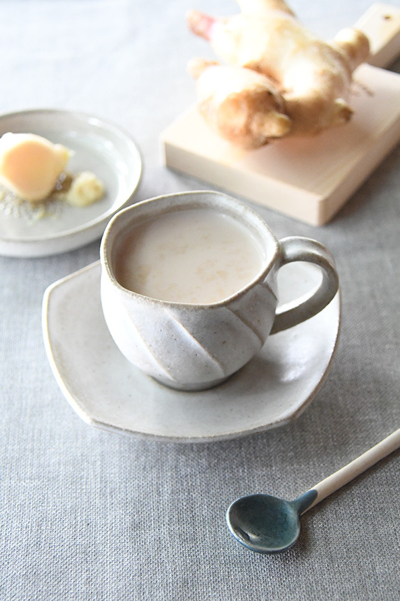 - [1]に新生姜と牛乳を加えて中火にかけ、沸騰寸前で火をとめ、茶こしで濾して器に注ぐ。