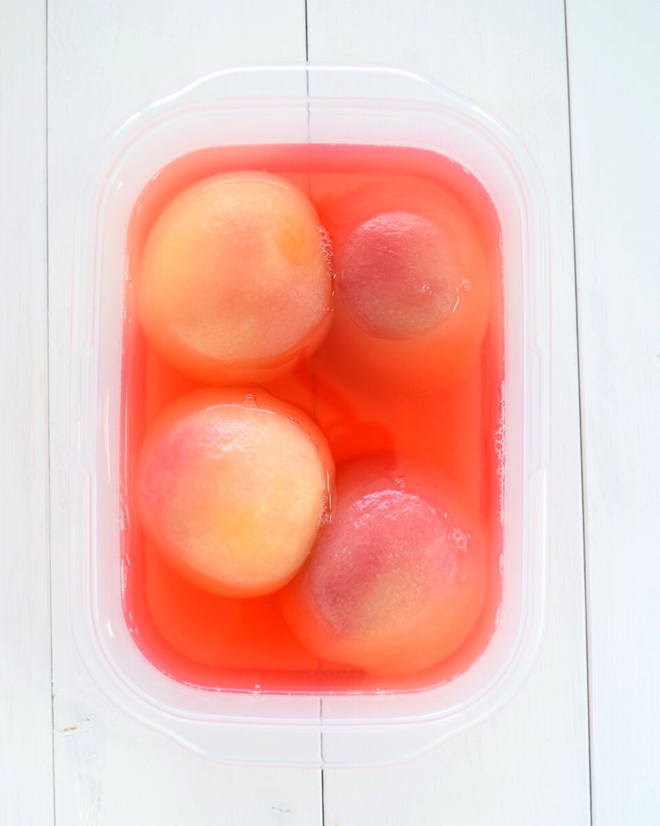 - 耐熱ボウルに桃の煮汁150ml、水150ml、砂糖25gを加え、レンジ500w2分30秒加熱する。[c]をレンジ500w15秒加熱し、ボウルに少しづつ加えながら混ぜ合わせる。氷水で粗熱を取る。