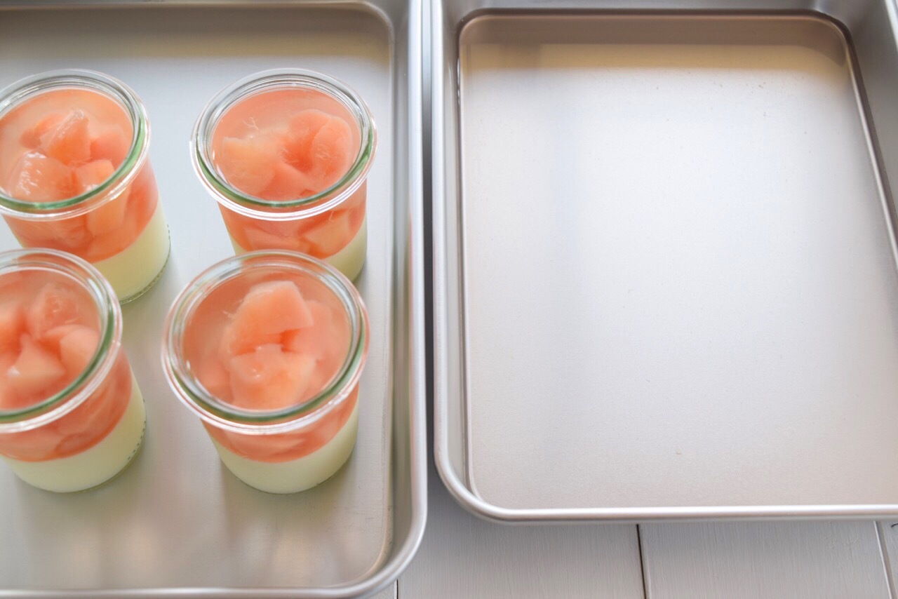 桃のコンポートを1.5cm角に切る。飾り用に何切れか残し、残りをミルクプリンの上に乗せ、ゼリーカップの9割くらいまで5を注ぐ。残りの煮汁は、バットに流す。冷蔵庫で冷やし固める。