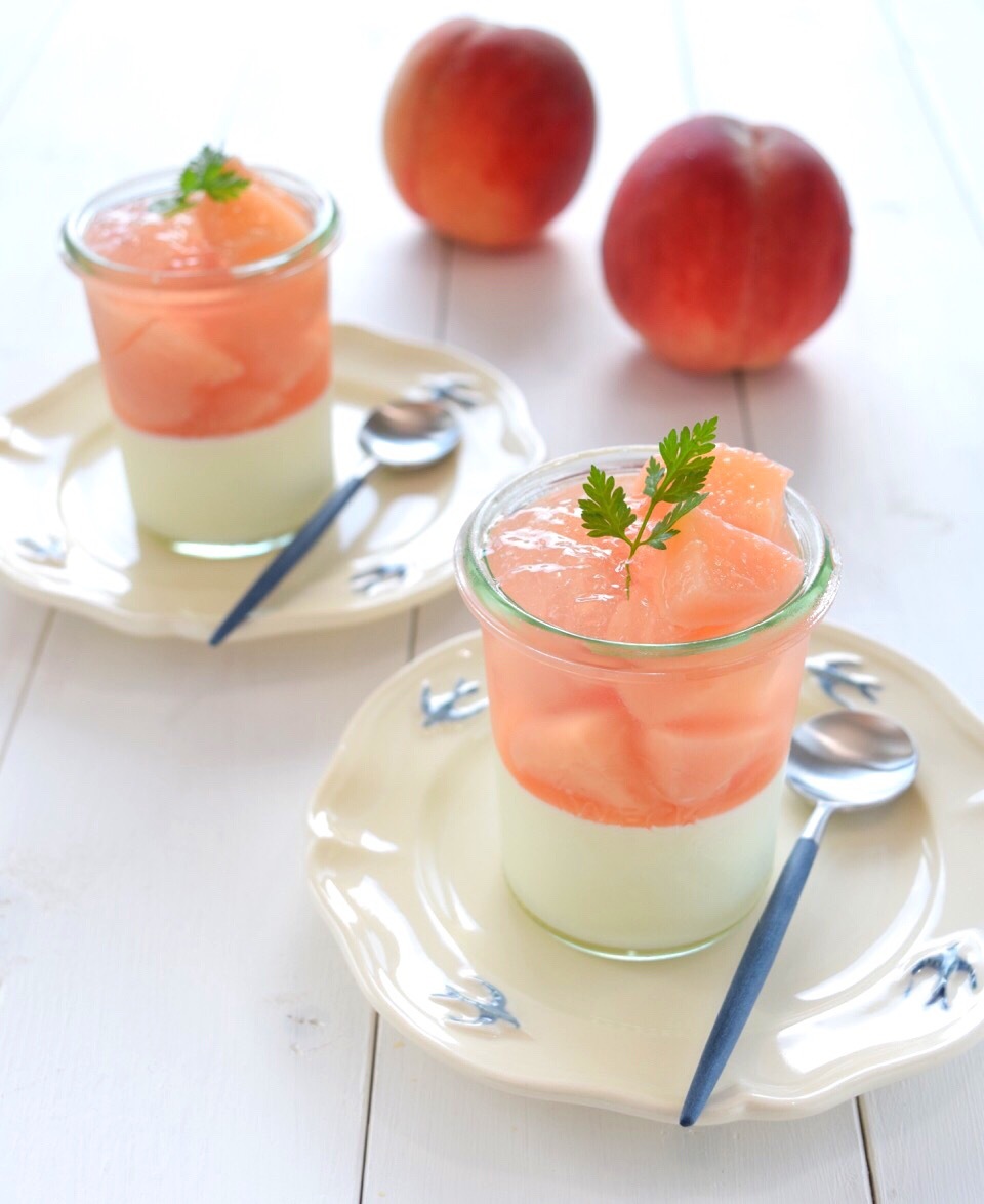 桃のコンポートを使ったゼリーと、ミルクプリンの2層が楽しめます。※所要時間は作業している時間になります。冷やす時間は長めに取って頂くと綺麗に仕上がります。コンポートは前日に仕込んでおくと、桃が綺麗なピンク色になります。