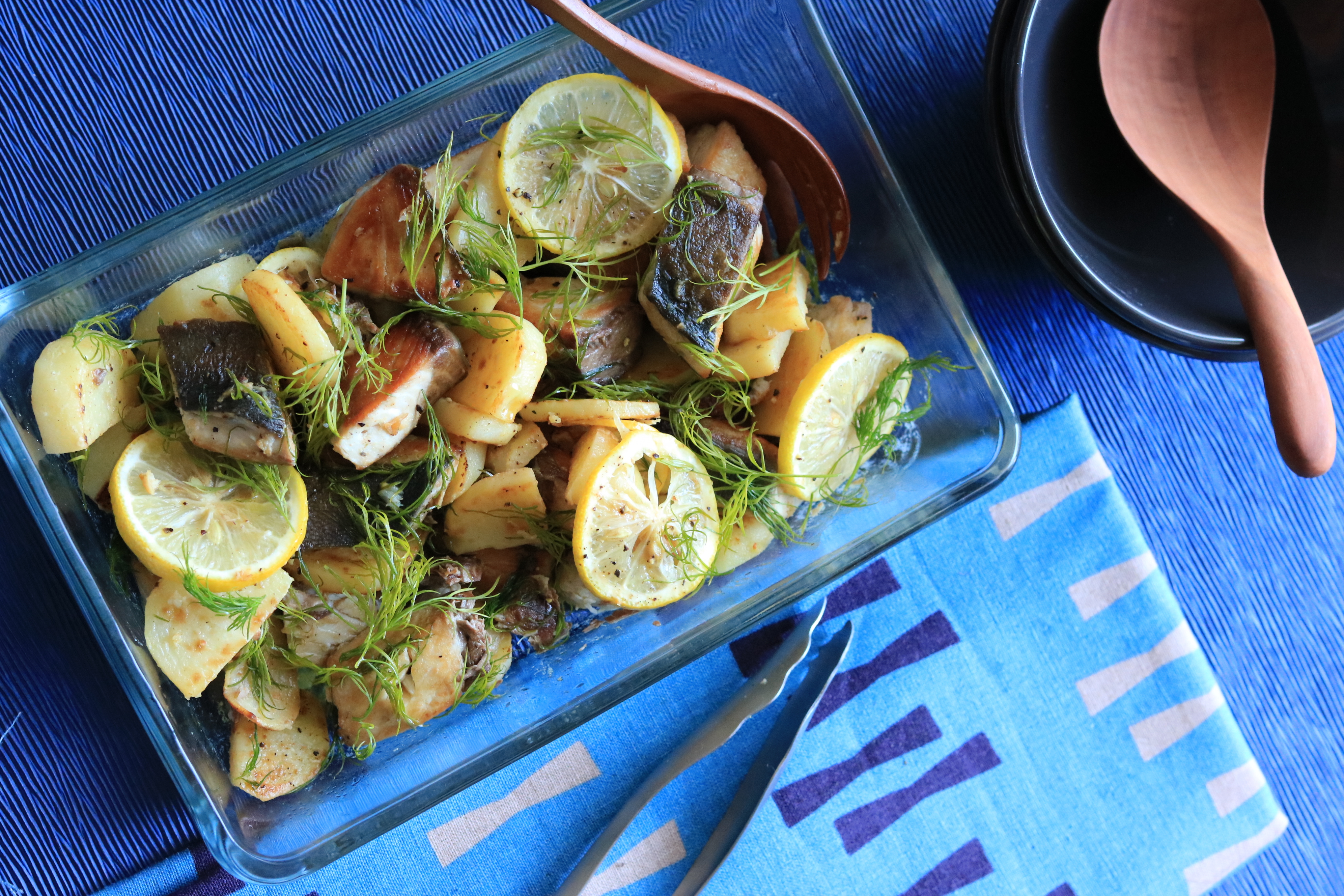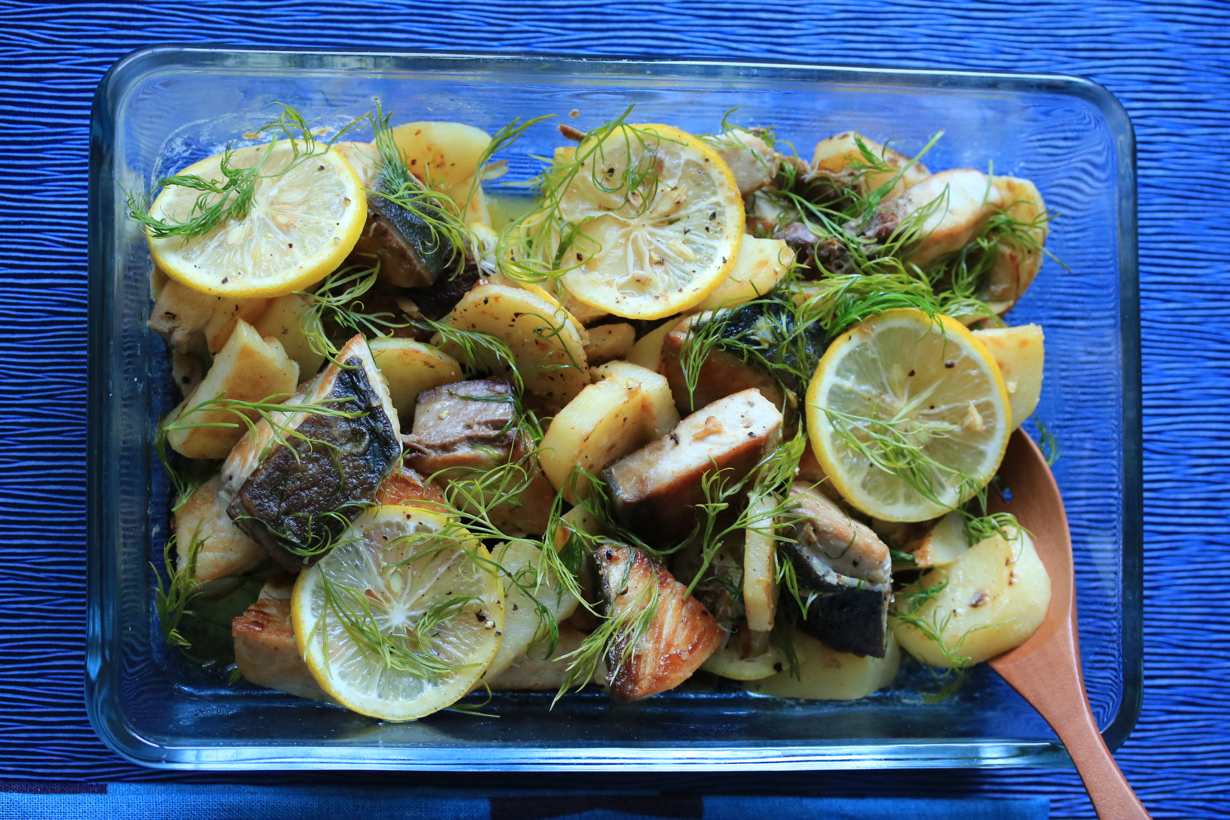 - ジャガイモは皮を剥き1cmの厚みの半月切にして水に5分さらしたら水気を取っておく。ブリは小骨を取り、塩を振って1口大にハサミで切っておく。ディルは茎が固いので葉先を摘んでおく。