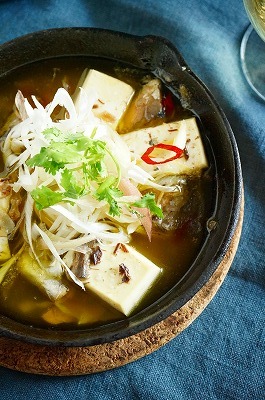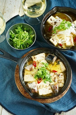 豆腐と手軽に使えて栄養満点のサバ缶を汁ごと使用し、ナンプラーを加えて一味違ったアヒージョになってます。