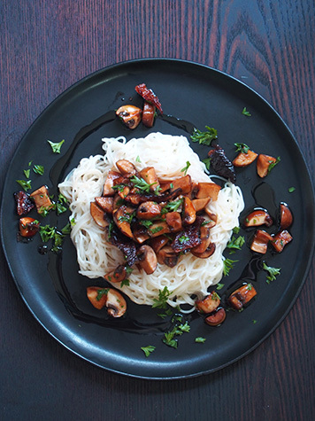 低温のオリーブオイルでじっくり揚げた干し椎茸はサクッと軽やかな食感。椎茸のコクや旨みが移ったオイルでマッシュルームを炒め、旨みがぎゅっと詰まったソースで素麺を和えながらいただきます。