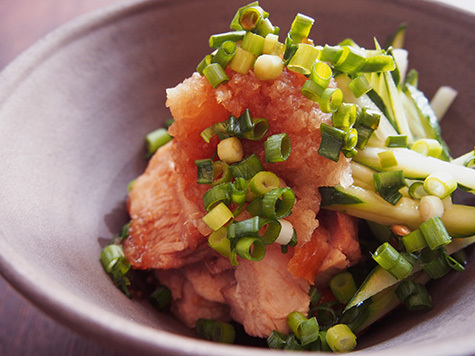 - 器に鳥もも肉、きゅうり、大根おろし、細ねぎを盛り、ポン酢をかける。