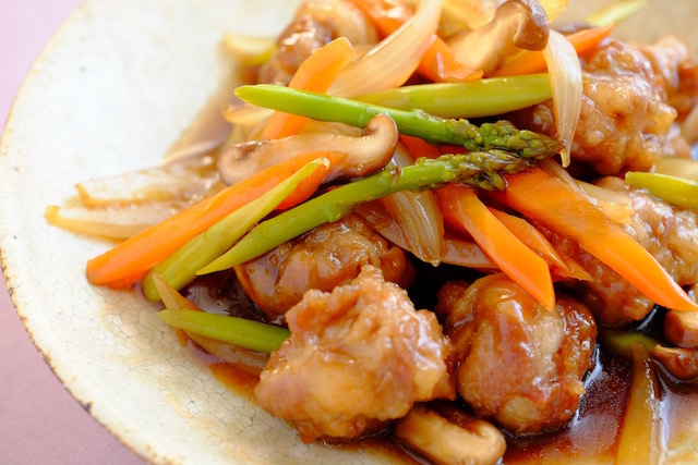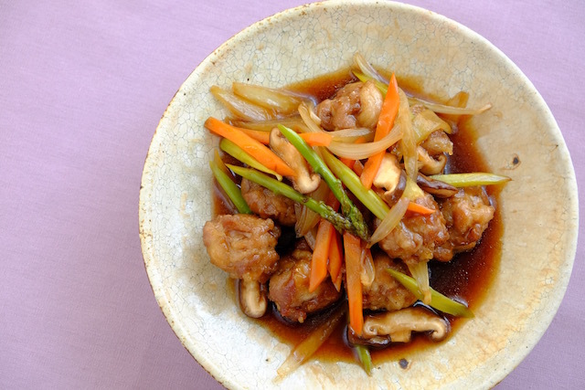 - フライパンの油を大さじ2くらいまで減らして、たまねぎ・にんじん・アスパラガスを炒める。しんなりしてきたら豚肉の団子を戻し入れ、Bと水溶き片栗粉を入れ、とろみがつくまで炒め合わせる。